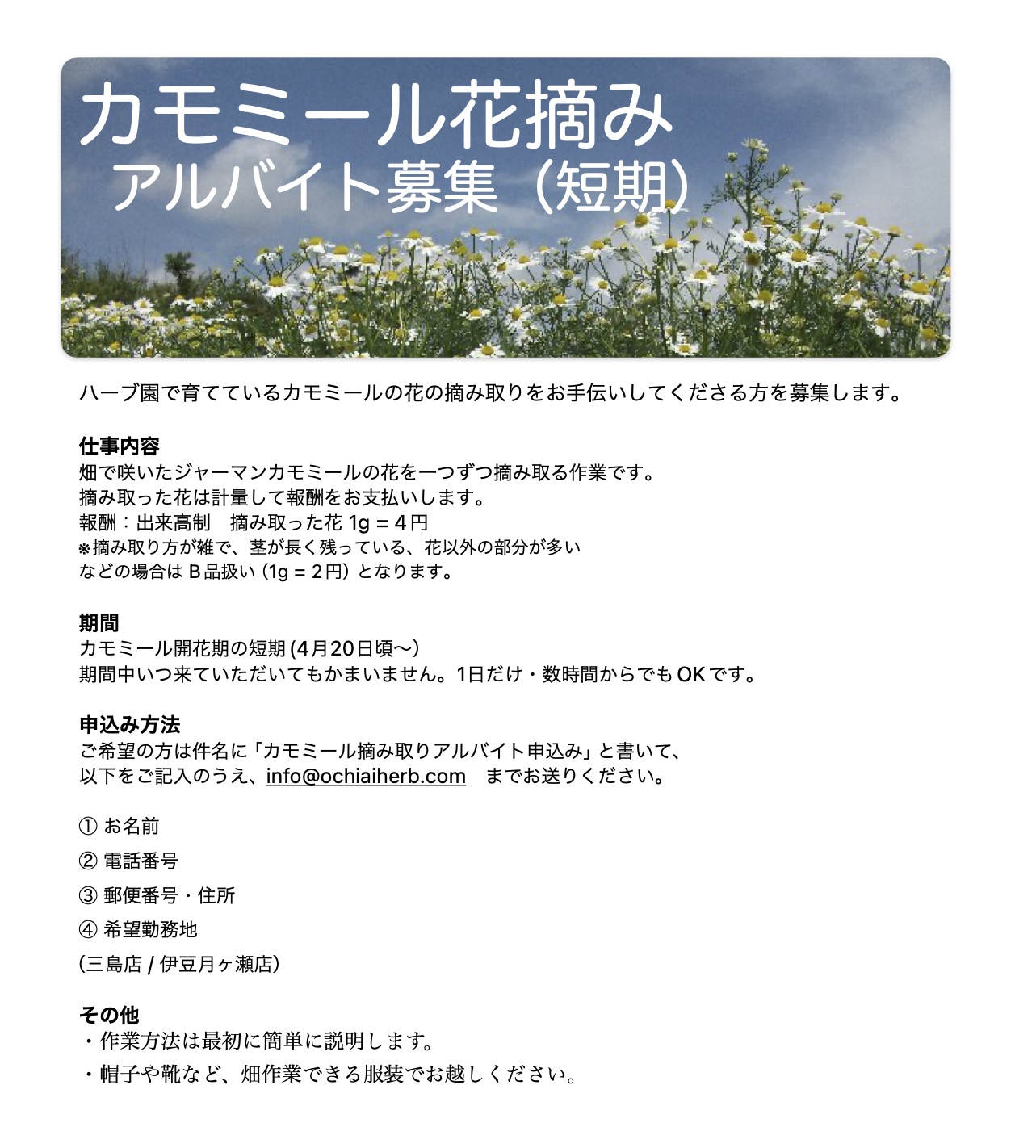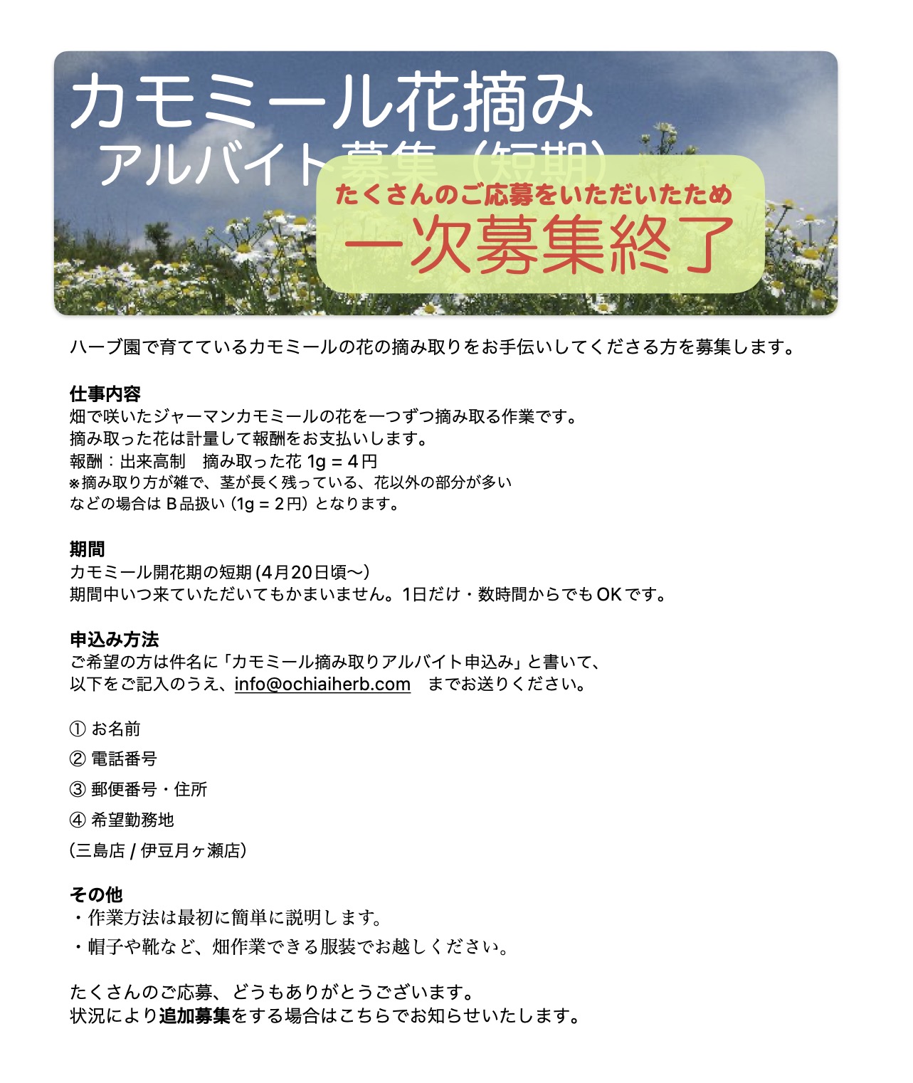こんにちは。店長の落合です。「人のからだに良いはずのハーブに農薬などは使わない。」という信念のもと、私どもは平成8年から完全無農薬栽培を徹底して貫いています。